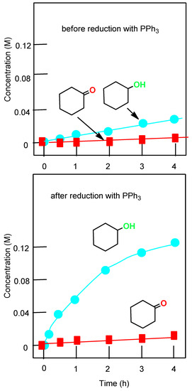 The experiment shown in Figure 5 demonstrated that the reduction of the reaction solution with PPh3 gave rise to a higher concentration of cyclohexanol and a decrease of cyclohexanone concentration (compare top and bottom graphs in Figure 5). These changes testify that the alkyl hydroperoxide was formed in the course of the oxidation (the so called Shul’pin method [51,52,53,54,55,56,57,58,59,60,61,62,63,64]).