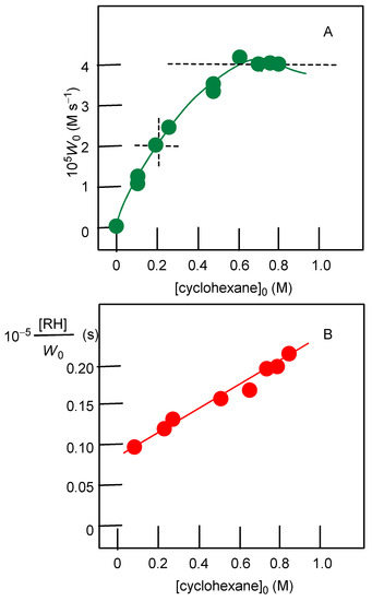 The dependence of the reaction rate on the temperature of the reaction solution obeys the Arrhenius law, which allowed us to measure the effective activation energy (see Figure 7). The activation energy of cyclohexane oxidation was equal to 13.6 kcal/mol. The main increment of this value was from the process of catalytic H2O2 decomposition, which generated species inducing cyclohexane oxidation.