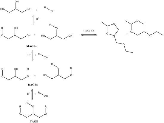 On the other hand, the peculiar structure of glycerol, possessing three –OH groups, offers several possibilities in terms of products and physical behavior, while also raising selectivity issues. The higher ethers with short alcohols, namely di- and tri- derivatives (DAGEs and TAGEs), find a direct application in diesel and biodiesel formulation by virtue of their water insolubility, while the higher polar and hydrophilic mono-ethers (MAGEs) are interesting intermediates for the production of chemicals, such as dioxolanes, in turn studied as fuel components as well (Scheme 3) [35,36].
