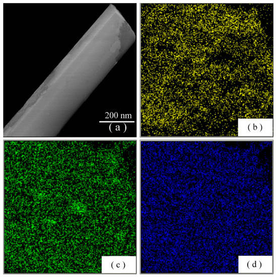 An element map is an image showing the spatial distribution of elements in a sample, and elemental mapping is carried out using EDX. Element maps are extremely useful for displaying element distributions in ZnWO4 nanoplates. Figure 5 depicts the EDX elemental maps of O, Zn, and W along one ZnWO4 nanoplate: (a) the ZnWO4 nanoplate; (b) O map; (c) Zn map; and (d) W map. As can be seen in Figure 5, the spatial distribution of each element in the ZnWO4 nanoplate was clear for the elements O, Zn, and W. We can conclude that the elements O, Zn, and W were uniformly distributed along the nanoplates.
