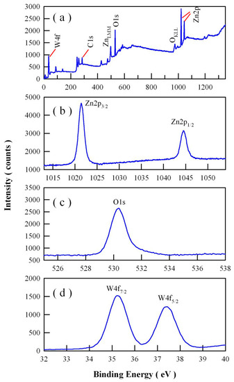 Figure 11 illustrates the XPS survey scan (a), and the XPS spectra of Zn 2p (b), O 1s (c), and W 4f (d) in ZnWO4 nanoplates. As shown in Figure 11a, the XPS survey spectrum illustrates clearly that ZnWO4 nanoplates were mainly composed of Zn, O, W, and C [15,17,20,21,22,23]. The peaks of Zn 2p1/2 and Zn 2p3/2 in Figure 11b were located at 1044.48 and 1021.43 eV, respectively, indicating that the zinc in ZnWO4 nanoplates had a +2 oxidation state. When compared to the two peaks of Zn 2p3/2 (1021.8 eV) and Zn 2p1/2 (1044.8 eV) in ZnWO4 nanofilms [4], the two peaks of ZnWO4 nanoplates were shifted by 0.03 and 0.32 eV toward the lower binding energy. As shown in Figure 11c, the XPS spectral profile of O 1s was located at 530.38 eV. The peaks of W 4f7/2 and W 4f5/2 in Figure 11d were located at 35.23 and 37.43 eV, respectively.