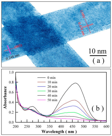 In order to verify the importance of crystal facets, we prepared ZnWO4 nanoplates with different facets ({100}, {010}, and {001}) and then investigated their photocatalytic performances. By varying the pH value in the mixture filled in the Teflon-lined stainless-steel autoclave, we obtained ZnWO4 nanoplates with a {100} facet, ZnWO4 nanoplates with a {100} facet, and ZnWO4 nanoplates with a {100} facet, respectively [10,15]. Figure 16a shows the high-resolution TEM micrograph of ZnWO4 nanoplates with a {100} facet. As can be seen in Figure 16a, the spacing of two adjacent (010) crystallographic planes was 0.570 nm, whilst the spacing of two adjacent (002) crystallographic planes on the same nanoplate was 0.246 nm. The normal of the facet could be determined as <100> by the vector product of the two orientation vectors <010> and <002>. Thus, the facet of this ZnWO4 nanoplate could be noted as {100}. Figure 16b depicts the absorption spectra of methyl orange solution as a function of UV irradiation time in the presence of ZnWO4 nanoplates with a {100} facet. As shown in Figure 16b, the absorption band peaking at 463 nm disappeared completely upon UV irradiation for 50 min, indicating the complete destruction of the –N=N– bonds in the methyl orange molecules. Instead of a complete disappearance, the absorption band peaking at about 270 nm weakened with a loss of about 40% of its original intensity, indicating partial destruction of the conjugation in the aromatic rings in methyl orange. When compared to the data in Figure 9, the data in Figure 16 demonstrate that the photo-oxidative capability of ZnWO4 nanoplates with {100} facets was weaker than that of ZnWO4 nanoplates with {01} facets.