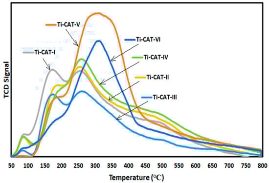 All catalysts, except Ti-CAT-V and Ti-CAT-VI, showed the same basic site classification, because the CO2 desorption peaks appeared at almost the same different temperature ranges (Figure 1). Both Ti-CAT-V and Ti-CAT-VI have basic sites correspoding to site of high and strong basicity centered at a temperature around 310 °C.