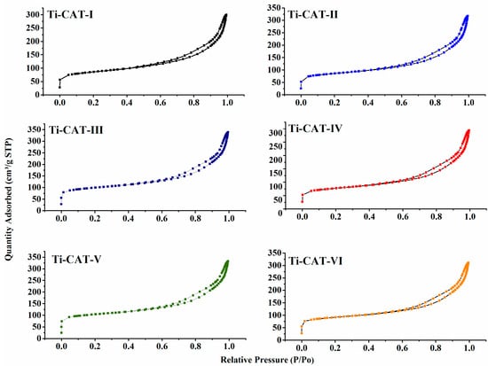 For the peaks appearing at different temperature ranges, peaks in the temperature range of 50–125 °C correspond to weak basic sites, peaks at 160–185 °C fall under the category of intermediate strength basic sites, while the peaks at 260 °C correspond to strong basicity sites. An elbow peak was observed for all of the samples, except for Ti-CAT-V and Ti-CAT-VI, at temperature centered around 500 °C. This peak had no significant CO2 uptake.