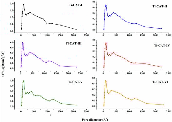 Type II isotherms constitute macroporous adsorbents, and for detailed study, the BJH pore size distribution is represented in Figure 2. All the Ti-CAT samples displayed a bimodal mesoporous/macroporous distribution curve with average pore size in the range 11.5–12.5 nm, typical for macroporous adsorbents with large surface area. For example, Jiang et al. [] and Zhao et al. [] synthesized macro-mesoporous bimodal titania with high surface areas. Here, the effect of surface area variation is observed when Mg, Ce, and Ni were combined. Table 2 shows that surface areas of the combined metal catalysts are reduced in relation to single-metal component catalysts. This observation is due to the combined metal deposition on the porous structure of the support and filling pores [].