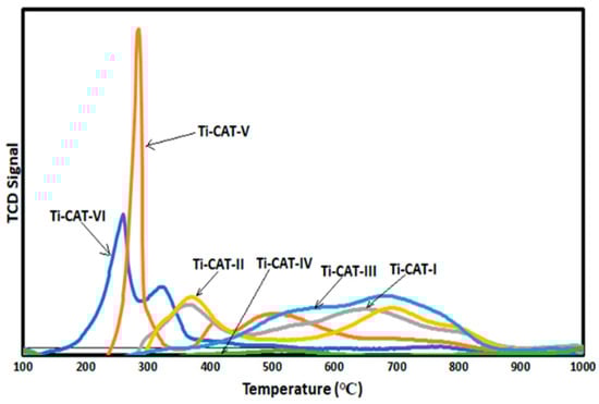 The reduction behavior of the different catalyst samples was investigated using H2-TPR and the profiles are presented in Figure 3. The nickel reduction peaks for Ti-CAT-x (x = I, II, III) samples containing Ni combined with other metals, are characterized by three reduction regions at low, medium and high temperature ranges. Their ranges are dependent on the degree of dispersion and interaction of the active metal with the support. The nickel phase reducibility was influenced by the combination of the metal oxides. The reduction peak in the temperature range of 280–380 °C is assigned to the reduction of NiO having weak interaction with the support. Higher temperature peaks (600–700 °C) are likely due to the reduction of NiO species having strong interactions with the support. The reduction peak of Ni2+ derived from spinel is found at around 810 °C [].
