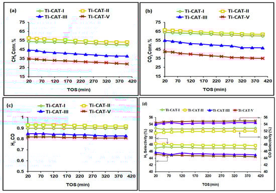 Catalytic performance of Ti-CAT-I, Ti-CAT-II, Ti-CAT-III, and Ti-CAT-V (a) CH4 conversion (b) CO2 conversion and (c) H2/CO ratio and (d) H2, CO selectivity.