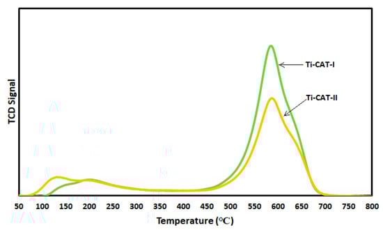 TPO is a useful technique that can be employed to determine the nature of the carbon deposited onto the surface of the catalysts. Several forms of carbon deposition have been reported in dry reforming reactions—ranging from atomic carbon, to graphitic, and amorphous carbon. The carbon can undergo gasification to form CO2 under oxidative atmosphere and at different temperature ranges. The atomic carbon, amorphous, and graphitic carbon can be gasified at temperatures less than 250, 250–600, and >600 °C, respectively []. The TPO profiles of Ti-CAT-I and Ti-CAT-II spent catalysts are shown in Figure 5. Each of the catalysts exhibited a broad peak near 600 °C and a low-intensity shoulder at 100–250 °C. According to the TPO results, the carbon deposited on both Ti-CAT-I and Ti-CAT-II spent catalysts revealed the formation of carbon atoms, mostly amorphous carbon, and a small amount of extent graphitic carbon.