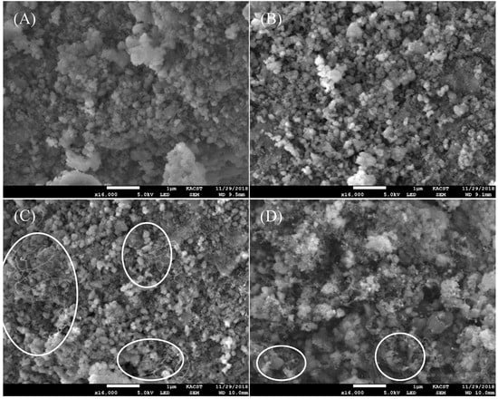 We used scanning electron microscopy (SEM) to determine the change in morphology of the spent catalysts. Figure 6 shows the SEM micrographs for the best two catalysts: Ti-CAT-I and Ti-CAT-II. Similar morphology, based on agglomerated, spherical nanoparticles, was observed for both fresh catalysts (Figure 6A,B). Such an observation was expected, because both catalysts were synthesized using an identical preparation procedure and had similar components.