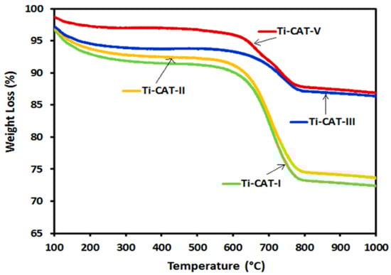 After the 7 h reaction, we analyzed the used catalysts by thermal gravemetric analysis (TGA), a quantitative analysis that determines the amount of carbon deposition. Figure 7 shows the result of the analysis. Catalysts that showed no sign of reaction were not reported. The weight loss (%) for virtually all the catalysts began at around 620 °C. The TGA profiles revealed that both Ti-CAT-V and Ti-CAT-III catalysts had the lowest weight loss, ~15.0%, while the two most reactive catalysts (Ti-CAT-II and Ti-CAT-I) had the highest amount of carbon deposition, corresponding to a weight loss of 25.0%.