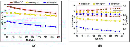 The effect of gas hourly space velocity (GHSV) was studied on the catalyst that showed the best performance in the previous section (i.e., Ti-CAT-II catalyst). GHSV of and were considered at 700 °C and time-on-stream over 7.0 h for DRM, while keeping the mass of the catalyst constant. These GHSV values are half and twice as much as the initial GHSV of 39,000 mL g−1 h−1, respectively. The results, in terms of CO2 and CH4 conversions, as well as H2/CO mole ratio, were calculated and plotted in Figure 8A,B. As the GHSV increased, the CH4 and CO2 conversions decreased, with the highest conversions for both CH4 and CO2 being obtained at a GHSV of . The decrease in conversions can be attributed to the feed having less residence time at higher GHSV []. A similar trend was observed with H2/CO mole ratio, where it decreased from a ratio of 1 to ~0.8. However, the results at GHSV of 39,000 were the most stable in comparison to those obtained at other GHSV values.