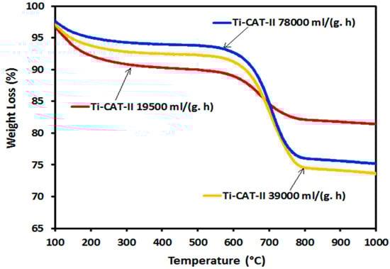 TGA curves for Ti-Cat-II at 19,500, 39,000 and 78,000 mL/(g·h) GHSV values.
