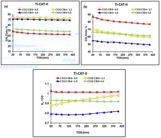 The mole ratio of CO2 to CH4 was changed at a fixed total flow rate to study the performance of Ti-CAT-II catalyst when CH4 was supposed to act as the limiting reagent in excess of CO2 at 700 °C and 39,000 mL g−1 h−1 GHSV. The results are shown in Figure 10a–c. The highest CH4 conversion of about 78% was obtained when CO2 was 20% in excess of CH4, while the least conversion of CH4 (~43%) resulted when the amount of CO2 was 50% of the required stoichiometric amount in the feed. This observation was expected, as CH4 would have enough CO2 to undergo dry reforming. On the other hand, the highest CO2 conversion of (~90%) was observed when CO2 was the limiting reagent. This observation could be due to excess CH4 present in the feed. The CO2 conversion was reduced with the reaction time-on-stream. Such observation could be ascribed to the disproportionation of carbon monoxide into CO2 and graphite, a transformation known as the Boudouard reaction: