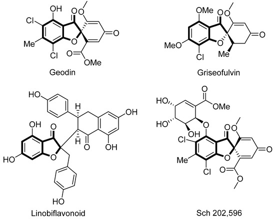 - Petersen, A.B.; Rønnest, M.H.; Larsen, T.O.; Clausen, M.H. The chemistry of griseofulvin. Chem. Rev. 2014, 114, 12088–12107. [Google Scholar] [CrossRef] [PubMed]
