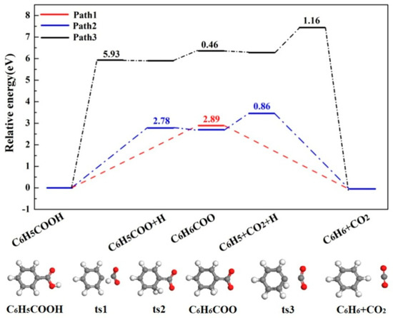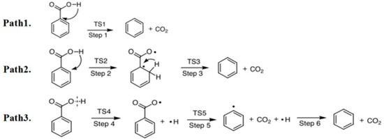 As shown in Figure 1, three possible pathways are studied for C6H5COOH pyrolysis: C6H5COOH →CO2 + C6H6 (Ea = 2.89 eV, ΔH = -0.05 eV), C6H5COOH →C6H6COO (Ea = 2.78 eV, ΔH = 2.70 eV), and C6H5COOH →C6H5COO + H (Ea = 5.93 eV, ΔH = 5.90 eV). The energy barriers of pathways 1 and 2 are similar, which are far lower than that of pathway 3. Therefore, pathways 1 and 2 for C6H5COOH pyrolysis are possible, which is similar with our previous study [20]. The potential energy diagrams of C6H5COOH pyrolysis and the corresponding initial states (IS), transition states (TS) and final states (FS) are shown in Figure 2. As shown in Figure 2, the pyrolysis pathways of C6H5COOH are C6H5COOH →CO2 + C6H6 and C6H5COOH →C6H6COO →CO2 + C6H6, which are in accordance with the experimental results [25,26,27].