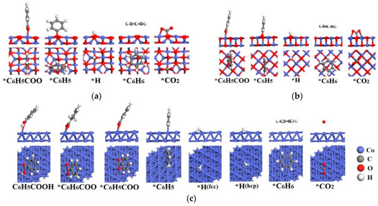 Structures of the possible intermediates of C6H5COOH pyrolysis on (a) Co3O4(110)-B, (b) CoO(100) and (c) Co(111) surfaces.