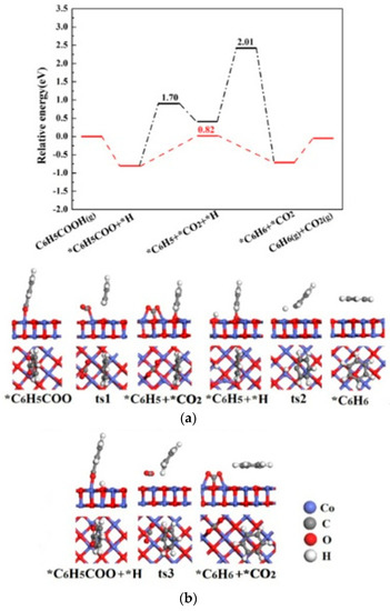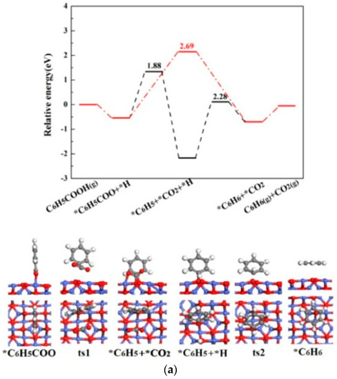 The potential energy diagrams (Red line: C6H5COOH(g)→ *C6H5COO + *H → *CO2 + *C6H6→CO2(g) + C6H6(g); Black line:C6H5COOH(g)→ *C6H5COO + *H →*C6H5 + *CO2 + *H→*CO2 + *C6H6→CO2(g) + C6H6(g)) and corresponding IS, TS, and FS geometrical structures of C6H5COOH catalytic pyrolysis on CoO(100) surface (a) related to black line; (b) related to red line.