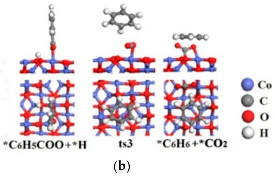 The adsorption structures of possible intermediates of C6H5COOH catalytic pyrolysis on Co3O4(110)-B, CoO(100) and Co(111) surfaces are shown in Figure 3. The corresponding adsorption energies and geometrical parameters are shown in Table 1.