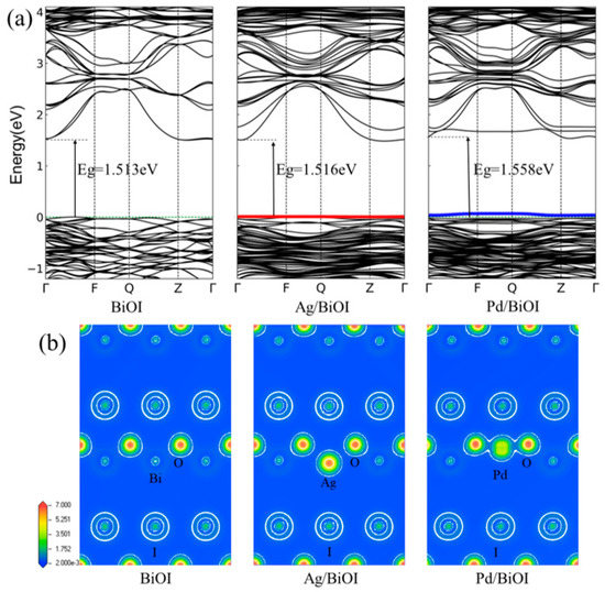 Many studies have been further attempted to reinforce the photocatalytic activity of BiOX systems, such as heterostructure designs of BiOBr/AgBr, BiOCl/BiO3, BiOBr/BiOI [24,25,26,27,28,29] and some specific impurity doping [30,31,32,33]. Dai et al. proved that the photoluminescence, photocatalytic activity, and strong optical properties of Eu3+-doped BiOX (X = F, Cl, Br, and I) could be enhanced using the density functional theory (DFT) method [30]. Zhao et al. explored the catalytic mechanism of BiOX1−rYr (X, Y = F, Cl, Br, I, 0 < r < 1) from the perspective of lattice constants, band gaps, and optical properties, and the results showed that the optical properties linearly vary as a function of the r-value and the band gap of BiOX1−rYr solid solutions can be tuned from 1.7–4.0 eV by changing the halogen composition [31]. Also, the co-doping of Sb and I atoms in BiOCl can obviously decrease the band gaps and increase the optical absorption coefficients [28]. In Yu’s experiments, transition metals, such as Ag, Pd, Pt, and Rh are also important dopants which could be considered to enhance the optical properties and photocatalytic performance of BiOX (X = Cl, Br, and I) [32,33]. It was reported that the Ag-doped BiOX-based system had higher VLD (visible-light-driven) photocatalytic activity due to the degradation of rhodamine B [34]. Other ternary heterojunction compounds Ag/AgBr/BiOIO3 are synthesized which show strengthened photocatalytic activity owing to the Ag doping [35]. Kim group synthesized the Ag and Au doped BiOCl/BiOClxI1−x compounds and proved that the light absorption and photocatalytic activity of these samples were improved [36].