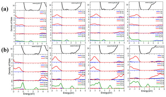 The density of state (DOS) of D-doped BiOX (X = F, Cl, Br, I). (a) The DOS of Ag-doped BiOX and (b) the DOS of Pd-doped BiOX.