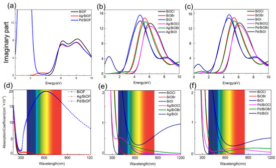 (a–c) The calculated imaginary part ε2 of the dielectric constants and the unit in eV; (d–f) Absorption coefficients and unit in nm of the pure and doped BiOX (X = F, Cl, Br, I) as a function of the energy of incident light.