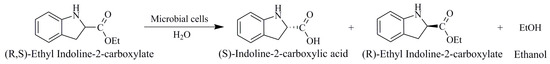 On the contrary, the biocatalytic method has attracted greater attention due to its mild reaction conditions, fewer by-products, and reduced heavy metal ions and organic reagents pollution. Cho’s patent used Savinase to hydrolyze (R, S)-methyl indoline-2-carboxylate [18]; the substrate concentration for this was 10%. They first obtained (S)-methyl indoline-2-carboxylate with e.e.s values at up to 99% and with a yield of 47% after five hours. Further hydrolysis in aqueous alkaline solution yielded (S)-indoline-2-carboxylic acid. Compared with the existing reports, the innovation of this research was that the whole cells of microorganisms were used as catalysts, reducing production costs by facilitating separation. Moreover, the reaction directly hydrolyzed the ethanol ester of (S)-indoline-2-carboxylic acid to obtain the products, reducing the number of reaction steps.