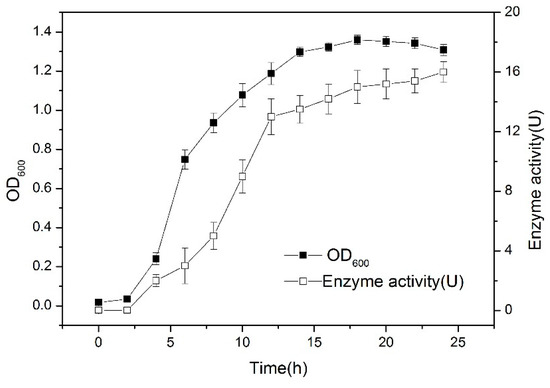 The optimal culture conditions are as follows: the best carbon and nitrogen sources are glucose and yeast powder, respectively; the inoculation amount was 1%, 180 rpm, and 30 °C for 24 h. Biomass (OD600) and enzyme activity were measured every two hours. The growth curve was as Figure 3: