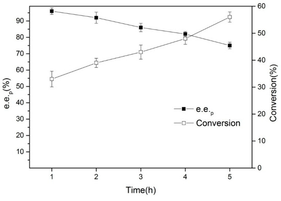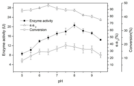 The pH can change the charge density, surface conformation, and the dissociation of the active center groups of the enzyme [9], thus affecting the enzyme’s activity in aqueous solutions. The pH can also affect the equilibrium of the reaction. Figure 4 shows the changes in enzyme activity and e.e.p within a 20-minute reaction at pH values of between 5.0–9.5 at 30 °C.