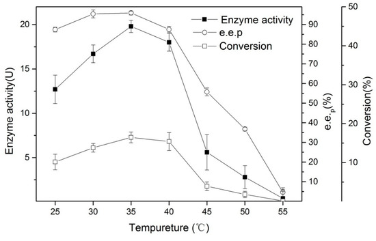 Temperature plays an important role in the thermodynamic equilibrium of reactions, and diverse reactions have different temperature requirements in industrial production. Therefore, an enzyme’s thermal stability is also an essential reference indicator. We studied the catalytic ability of Bacillus aryabhattai at varied temperatures (Figure 5). As the temperatures increased, the enzyme activity gradually increased, reaching a maximum at 35 °C. When the temperature exceeded 40 °C, the enzyme activity decreased rapidly. The e.e.p and conversion rates had the same trend as the enzyme activity. This indicates that a high temperature can seriously damage enzyme activity and selectivity.
