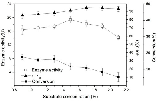 Substrate concentration is also one of the key factors in the enzymatic process. Excessive substrate concentration may cause substrate inhibition and affect enzyme activity and selectivity. We established a series of substrate concentration gradients (by mass fraction) and ran the hydrolysis reaction for 20 min (in Figure 6). The results showed that when the substrate concentration exceeded 1.5%, the enzymatic activity revealed a downward trend. The causes of its substrate inhibition were multifaceted. For example, the catalysts that were used in the reaction were from a lyophilized cell, and if the expression level of the cell’s target enzyme was low, it was possible for it to be suppressed at a lower substrate concentration. However, from the e.e.p trend, maintaining a certain substrate inhibition level assisted in increasing the e.e.p value of the final product. This necessitated reevaluating the amount of substrate that was added to the final scale production to obtain an improved e.e.p and yield.