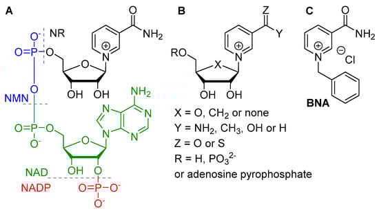 (A) Schematic representation of the natural NAD(P); (B) Naturally-based analogues; (C) synthetic analogue.
