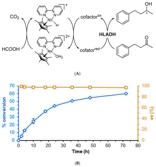 (A) Representative scheme of the HLADH-catalyzed reduction of 4-phenyl-2-butanone to enantioenriched 4-phenyl-2-butanol; (B) Time course of the reaction (blue diamonds, ee orange squares); NADH regeneration system with [Cp*Rh(bpy)(H2O)]2+ using sodium formate as a hydride source. Reaction conditions: 100 mM KPi pH 7.0, HLADH (2 U), [NAD] = 2.2 mM, [Cp*Rh(bpy)(H2O)]2+ = 0.52 mM, [HCO2Na] = 52 mM, [4-phenyl-2-butanone] = 16.7 mM, shaken at 30 °C, 800 rpm. Conversion and ee determined by chiral GC.