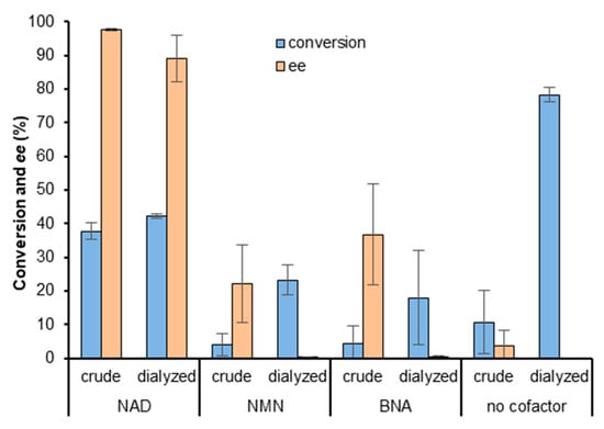 We could produce the expected results with the Rh-catalyzed regeneration of NADH under the same conditions (Figure 2B, 60% conversion 97% ee after 72 h) [27]. Next, we compared reaction results between the commercially available ‘crude’ (unpurified cell-free extract) HLADH and the dialyzed enzyme, with either NAD, nicotinamide mononucleotide (NMN) or BNA (Figure 3 and SI Table S3). When using either crude or dialyzed HLADH with NAD, after 18 h, conversions were similar (38–42%) with a good enantiomeric excess (>90% ee). However, the same reactions carried out in the presence of NMN, BNA, or in the absence of a cofactor showed 4–11% conversion and 4–37% ee compared to 18–78% conversion and <1% ee with the dialyzed enzyme (Figure 3).