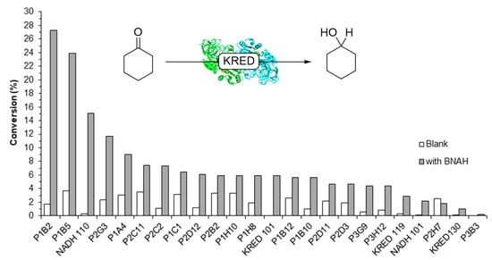 Screening of the ketoreductases (KREDs) Codexis kit. X-axis: KREDs. Y-axis: conversion to cyclohexanol after 24 h, measured by GC analysis, with BNAH (grey) and without BNAH (white). Reactions conditions: 50 mM KPi pH 7.0, [cyclohexanone] = 10 mM, [KRED] = 10 mg/mL, [BNAH] = 10 mM (where applicable).