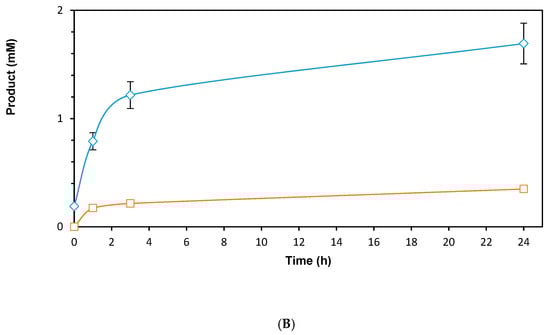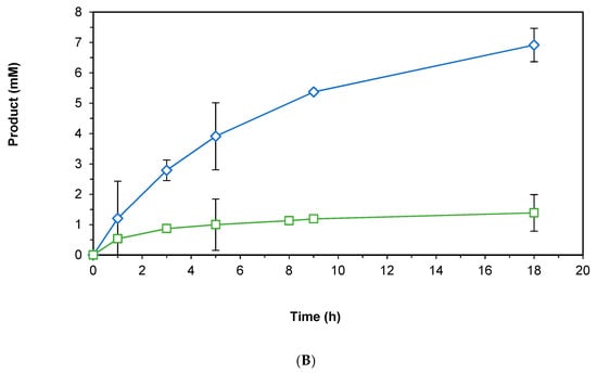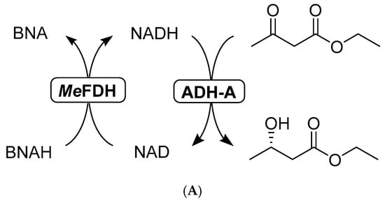 (A) Representative scheme of the ADH-A-catalyzed reduction of ethyl acetoacetate with MeFDH; (B) Time course of the reaction (blue diamonds) or without MeFDH (orange squares). Reaction conditions: 50 mM NaPi pH 7.0, ADH-A (0.6 U), [MeFDH] = 5 µM (blue diamonds) or 0 µM (orange squares), [NAD] = 0.1 mM, [BNAH] = 10 mM (solid), [ethyl acetoacetate] = 10 mM, shaken at 30 °C, 800 rpm, anaerobic.