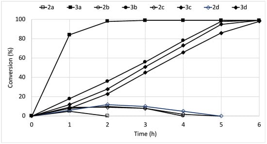 Time-course of the oxidation of achiral 2-substituted 1,3-diols 1a–d with immobilized cells of Acetobacter aceti 2000/28 in conventional shaken flasks (batch mode). Reaction conditions: 0.60 mmol of substrate, 2.0 g of alginate beads containing 500 mgdry weight of cells in 50 mL of acetate buffer (20 mM pH 6.0) at 28 °C.
