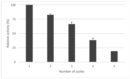 The stability of the immobilized cells was investigated by re-using the beads in successive reactions (Figure 2). The operational stability was quite limited, since more than 50% of the original activity was lost after three cycles of reaction.