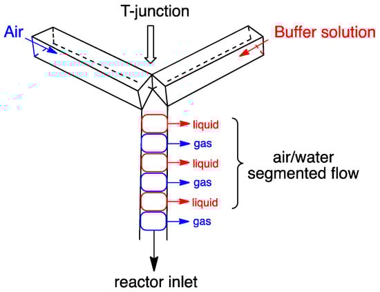 The transfer of gas (air or O2-enriched air) to the aqueous liquid phase is often the factor limiting the efficiency of liquid phase bio-oxidations [28,29,30]; a way to increase the reaction rate is to facilitate mass transfer by increasing the interfacial area and applying a segmented gas–liquid flow regime [31]. A segmented gas–liquid flow regime (Taylor flow) is characterized by gas bubbles alternating with short liquid slugs with recirculation occurring within segments of the two-phase segmented flow, providing an efficient mass transfer between the gas and liquid phases [18,31,32].