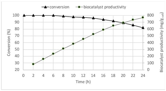 Continuous enantioselective oxidation of 1a with immobilized Acetobacter aceti MIM 2000/28 in flow under the conditions reported in Table 2, entry 5. Biocatalyst productivity is defined as the overall amount of product (mg) formed per dry weight of biocatalyst.