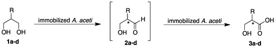 Oxidation of achiral 2-alkyl-1,3-diols using immobilized Acetobacter aceti. 1a: R = Me; 1b: R = Et; 1c: R = n-Bu; 1d: R = n-Pent.