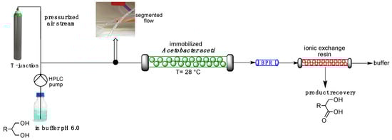 In this work, we have used immobilized cells of Acetobacter aceti MIM 2000/28 for the continuous flow oxidation of 2-alkyl-1,3-diols to chiral 2-hydroxymethyl alkanoic acids. The aim of the work was to intensify this heterogeneous aerobic oxidation using a flow reactor, after the previous observation that oxidation of 2-methyl-1,3-propanediol could be performed [32]. Continuous flow-based oxidation with immobilized cells was carried out under a segmented air–water flow regime. In particular, the reactor consisted of a packed bed reactor with immobilized cells fed with an aqueous solution containing the substrate and a gaseous stream of pressurized air. The three-phase system proved to be highly applicable to the oxidation of different 2-alkyl-1,3-diols with satisfactory selectivity and productivity.