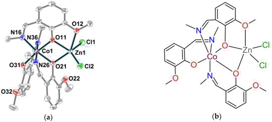 Complex 1 crystallizes in the monoclinic space group P21/n. It is built of [CoZnL3Cl2] neutral molecules with the metal centers bridged by two deprotonated phenoxy groups from the two L– ligands. Solvent methanol molecules are involved in O–H···O hydrogen bonding. The molecular diagram of 1 with a numbering scheme is given in Figure 1, while selected bond distances and angles are presented in Table S1.