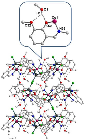 The crystal packing diagram of [CoIIIZnIIL3Cl2]·CH3OH (1) and the enlarged fragment demonstrating H-bonding between the solvent methanol molecule and deprotonated Schiff base ligand. H atoms are not shown. Color scheme: Co, magenta; Zn, dark grey; O, red; N, blue; C, light grey; Cl, green.