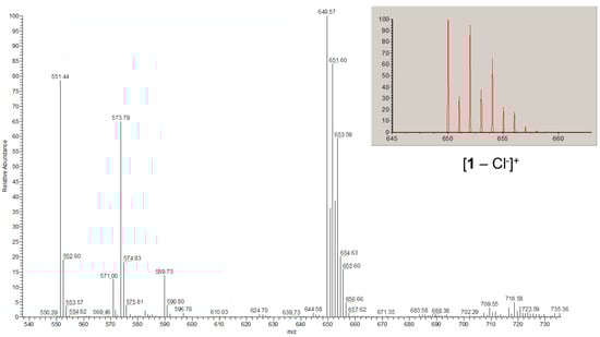 Fragment of the ESI-MS spectrum (Figure S3) in acetonitrile showing the isotopic distribution for the peak at 650 m/z attributed to the [1 – Cl–]+ species. The inset shows calculated distribution for the proposed species.