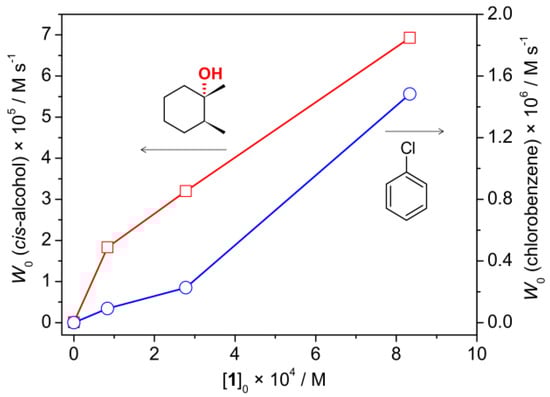 The catalytic activity of complex 1 was studied in the hydroxylation of sp3 C–H bonds of unactivated alkanes, under mild conditions. Oxidation of cis-1,2-dimethylcyclohexane (cis-1,2-DMCH) was chosen as a primary reaction. This substrate is a recognized model that allows simultaneous determination of stereo-, bond- and regio-preferences [2,26,35,43,44]. The reaction of m-CPBA, in the presence of nitric acid, with cis-1,2-DMCH, using various loadings of 1 (Table 1, Entries 1–3), afforded the tertiary cis-alcohol as the main product (Figure S6). The dependence of the initial reaction rate W0 on [1] was found to be linear, suggesting that no change of the catalyst composition occurs in the studied range of [1] (Figure 4). The extrapolated line for [1] = 0 M hints at a possible rather high activity with W0 ca. 1 × 10–5 M s–1 in the absence of 1. However, the reaction rate of the metal-free reaction was determined to be 3 orders lower, being equal to 6 × 10–8 M s–1. The reaction rate of chlorobenzene accumulation also follows the concentration of 1 (Figure 4), confirming that chlorobenzene by-product originates from the metal-catalyzed process rather than from spontaneous decomposition of m-CPBA.