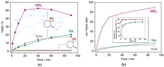 The accumulation curves for HNO3, TFA and HOAc promoters are given in Figure 5a. As can be seen, while the concentration of cis-tertiary alcohols continuously grows for the cases of TFA and HOAc, the HNO3 one shows a maximum at 40 min with the yield of the tertiary cis-alcohol of 52% (59% for sum of 3° and 2° products), which is considerably higher than 45% exhibited at 90 min (50% for sum of all products, Entry 3). The yield decay in the 40–90 min interval could be related to overoxidation processes with the appearance of reaction by-products, particularly 2,7-octanedione (Figure S6). It is presumably formed through the attack at a second tertiary C–H bond of the cis-alcohol and subsequent cyclohexane ring cleavage.