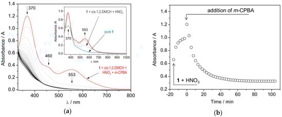The UV/Vis spectrum of the solution of 1 (1.4 × 10–4 M) in acetonitrile shows a number of absorption bands, with the most pronounced one at 370 nm and a very weak broad band at 680 nm (Figure 6a, inset, and Figure S7). The spectrum of 1 does not change with time suggesting the complex stability in CH3CN solution. The band at 370 nm can be assigned to intraligand π→π* transitions, while the second one (680 nm) could be due to phenolato-to-cobalt transfer [49,50]. The addition of HNO3 (final concentration 5.5 × 10–3 M) leads to strong increase of the 370 nm absorption and appearance of a new band at 553 nm. The spectrum exhibits changes within ca. 5 min after addition of HNO3, showing isosbestic points at 389, 420 and 669 nm (Figure 6a and Figure S8). Further addition of substrate, cis-1,2-DMCH, and then m-CPBA, in a minimum amount of acetonitrile to reach the final concentration of 1.3 × 10–3 M, leads to an overall intensity decrease with time, as evidenced by monitoring of the 370 nm band, finally showing broad absorption with no clear bands in the visible region (Figure 6b). These results may suggest that complex 1 undergoes transformation upon addition of the promoting agent. However, no expulsion of the ligand can be assumed as free HL has strong absorption at much higher energy at wavelength of 320 nm (Figure S9).
