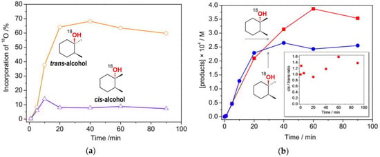 We expected that the system showing lower retention of stereoconfiguration would produce more 18O-labelled products, as it happens for iron-catalyzed oxidations with H2O2 [36,52]. cis-1,2-DMCH oxidation in the presence of HNO3 promoter, under 18O2, revealed pure tertiary alcohols free of 18O isotope (Figure S10). In contrast, the system involving acetic acid promoter showed large incorporation of 18O, up to 68% in the trans-alcohol and up to 14% in the cis-one (Figure 7a). The accumulations of 18O-labelled tertiary alcohols demonstrate similar initial reaction rates (Figure 7b), with the cis/trans ratios of the 18O-alcohols ranging from 0.9 to 1.6 (Figure 7b, inset). Such values are typical for a free-radical oxidation of alkanes, for example, with hydroxyl radicals being attacking species [40,53].