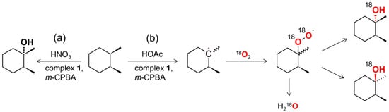 It is known that common C–H hydroxylation pathways (such as radical rebound, concerted, metal-mediated or free radical one) show drastically different 18O-incorporations into the final products, alcohols, from various sources, first of all 18O2, H218O and 18O-labelled peroxides [33,34,35,36]. For example, the use of 18O2, in combination with bond-, regio- and stereoselectivity data, provides evidence about the participation (or non-participation) of a long-lived free carbon radical in the catalytic mechanism [2,36,37,38,39,40,41]. However, this important area still remains underdeveloped.