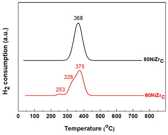 H2-TPR profiles of 60NiZrC and 80NiZrC catalysts.